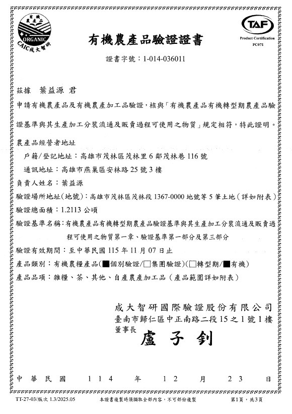 1.「有機」認証,有效期1年。