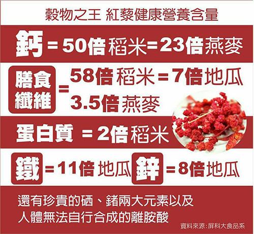 2.台灣原住民特有的紅藜,含有豐富的膳食纖維、蛋白質、鈣、鐵、鎂、錳、鋅。Omega3、Omega9及人體無法自己合成的8種胺基酸,堪稱動植物界中營養最完整的食物,因此在全球營養食物中,被公認為「超級食物」。