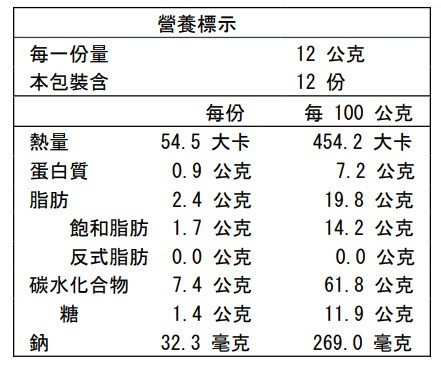麵粉(小麥麵粉、小麥澱粉)、白油(棕櫚油、抗氧化劑(混合濃縮生育醇))、水、糖、薑黃粉、黑胡椒、紅藜、鹽
