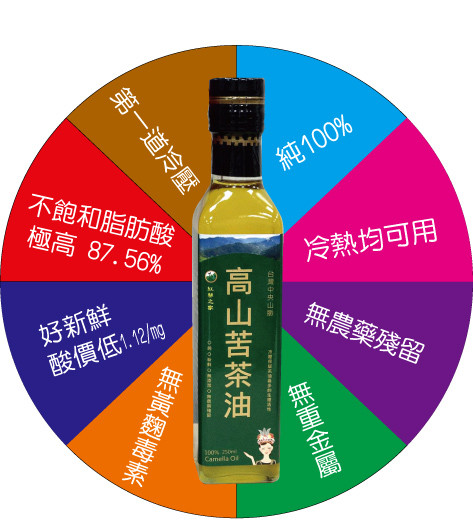 2.嚴選最上等高山原生苦茶籽,經採集日晒、去殼、低溫冷藏,維持每顆苦茶仁之新鮮度,並採低溫壓榨,取其鮮、甘、純之自然風味,含豐富天然營養素、茶多酚。油質穩定,低油煙,比進口橄欖油更優質,可用於煎、煮、炒、炸、拌麵(飯、菜)、沾食麵包(饅頭)及烘焙等烹調,或適量直接飲用。