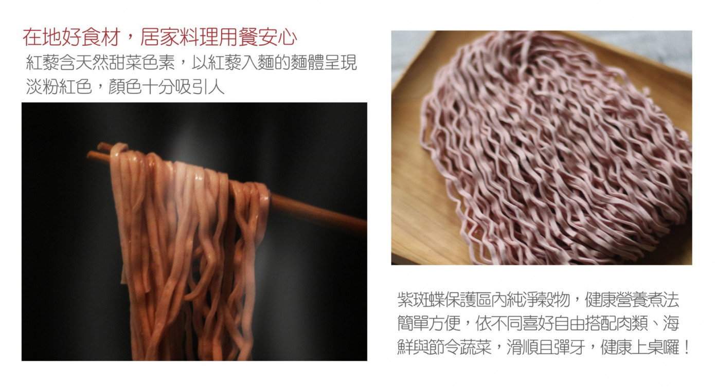公主麵的主要材料是《紅藜》,原料挑選有機紅藜,篩選掉雜枝,經低溫烘焙再磨成細粉,形成紅中帶紫的完美麵食,且含有人體無法自行合成的九種必需胺基酸,故有《穀類紅寶石》及《穀物之母》的美稱。
