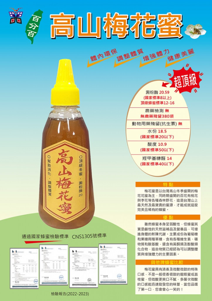 梅花蜜是以台灣高山冬季盛開的梅花花蜜為主,同時期盛開的百花有桃花與李花等各種森林野花,這是台灣山上最天然及最寶貴的蜜源。