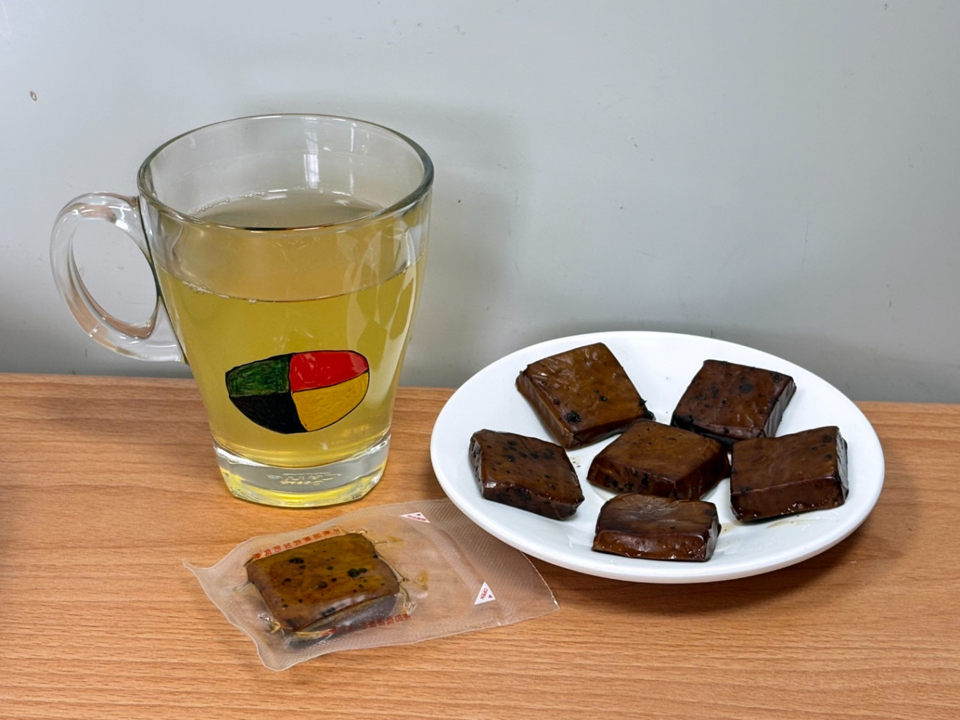 豆干(非基改黃豆、豆腐用凝固劑(硫酸鈣、無水碳酸鈉、消泡劑(脂肪酸甘油脂、碳酸鎂、卵磷脂))、糖、醬油(非基改黃豆、小麥)、馬告、肉桂、花椒、焦糖色素