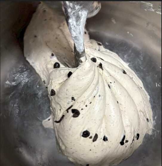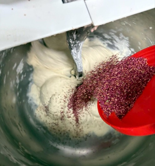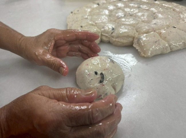 將麵粉攪拌成麵團過程中,加入紅藜、馬告碎狀、油及水